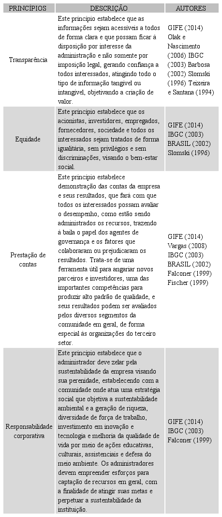 Foi analisado se as instituições aderem às boas práticas de governança conforme os princípios elencados pelo Instituto Brasileiro de Governança Corporativa (IBGC) e pelo Grupo de Instituições, Fundações e Empresas (GIFE).