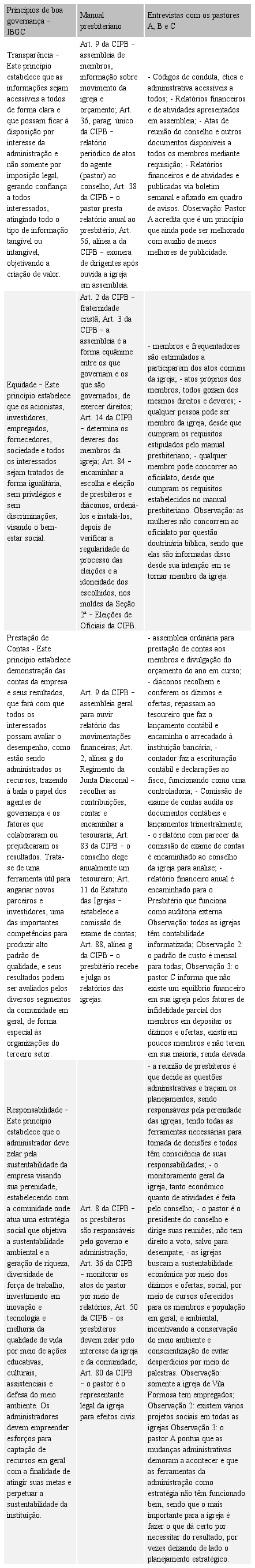 No Quadro 3, foi demonstrado o alinhamento entre o preceituado nas normas escritas da igreja, entrevistas com os pastores e os princípios das boas práticas de governança corporativa.