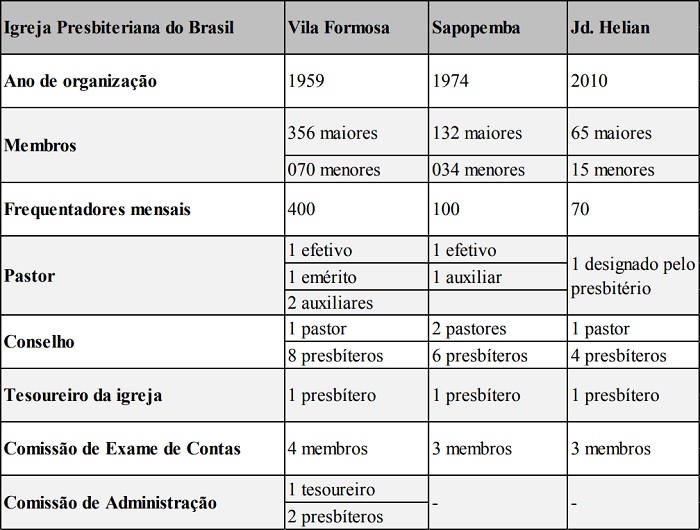 Nas entrevistas, o pastor da Igreja Presbiteriana de Vila Formosa foi denominado como Pastor A, o pastor da Igreja Presbiteriana de Sapopemba foi denominado como Pastor B e o pastor da Igreja Presbiteriana do Jardim Helian foi denominado como Pastor C.