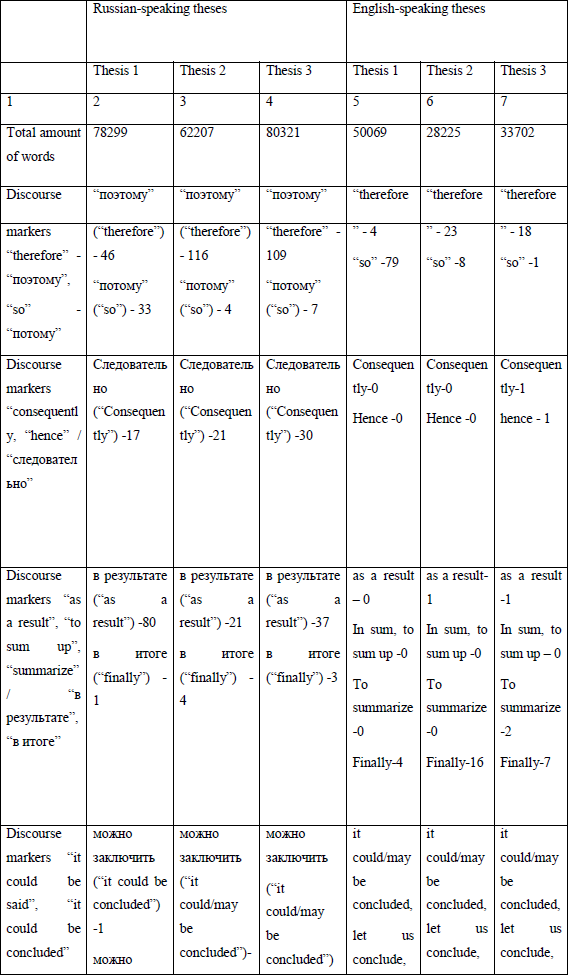 We have chosen the Russian theses of “doktor nauk” (a post-doctoral degree called Doctor of Sciences, which is given to reflect second (advanced) research qualifications or higher doctorates in ISCED 2011) due to the fact that, in accordance with the formal requirements of the Higher Attestation Commission of the Russian Federation (VAK, 2015), this scientific genre is more clearly structured, whereas Russian articles usually do not meet this requirement. Therefore, one might expect that Russian scientists are using discourse markers in the Russian theses of “doktor nauk” similarly to the way these are used in theses in English. In order to do our study comparable to the other, we also like Kogut chose discourse markers “therefore”, “it can be concluded”, “as a result”, “thus”, “consequently” (see: KOGUT, 2014, p. 24).