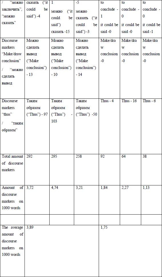 The table1 is presented the results (see Table1.) The average amount of discourse markers per 1000 words is 3,89 in Russian theses and 1,75 in theses in English. These results are similar to those obtained by Kogut (KOGUT, 2014).