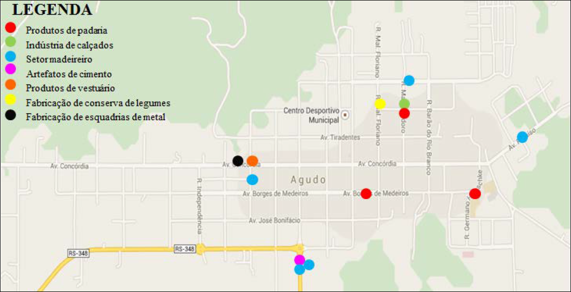 Outras atividades encontradas foram indústria de calçados, artefatos de cimento, produtos de vestuário, fabricação de conservas e fabricação de esquadrias de metal, representando 34,5% de empregos nas indústrias. Na Figura 1, está representada a localização dessas indústrias em Agudo.