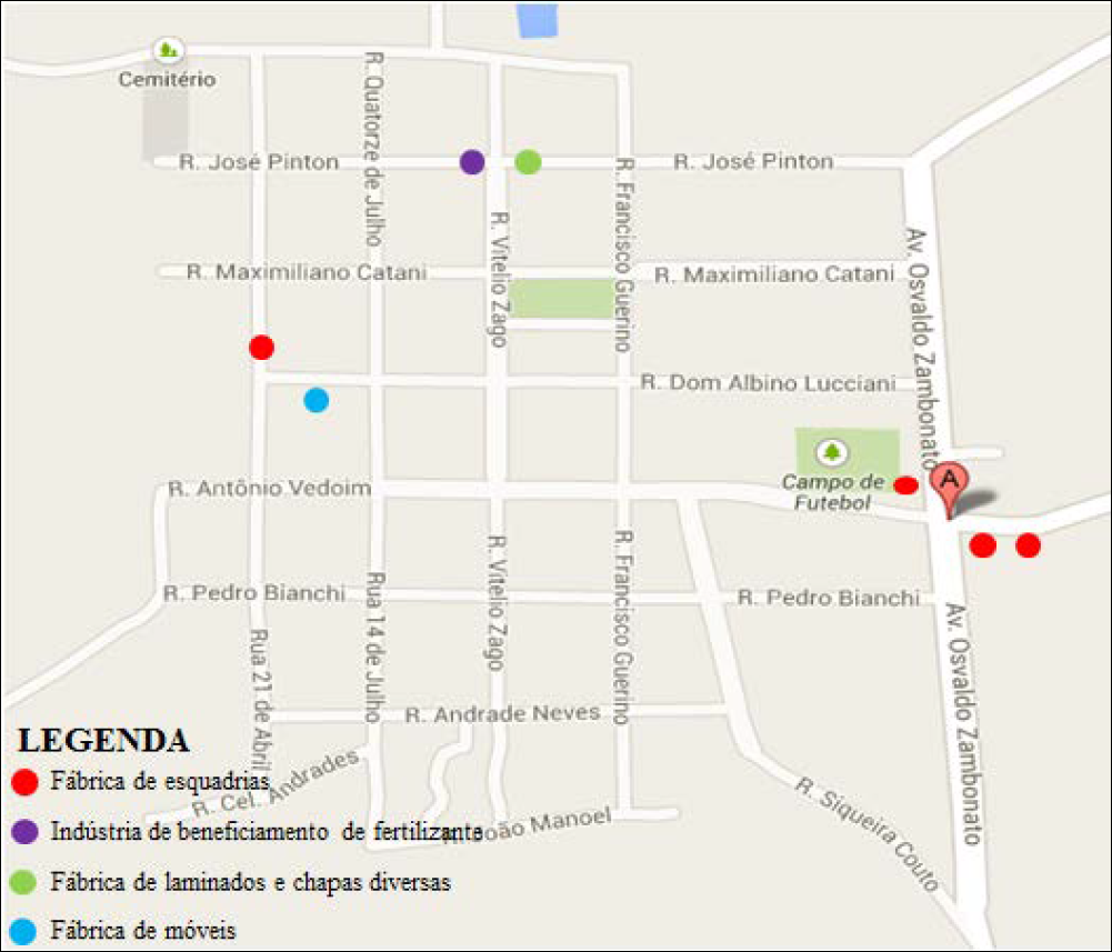 Segundo Gatto et al. (2005), na região da Quarta Colônia, em média, são encontradas onze empresas consumidoras de madeira por município. No presente estudo, verificou-se que 96% dos funcionários das indústrias locais atuam em alguma atividade relacionada ao processamento de madeira. A única fábrica que opera em uma atividade diferenciada da transformação da madeira é a CBF, atuando como beneficiadora de fertilizantes. Na Figura 2, é possível observar o mapeamento das referidas indústrias.