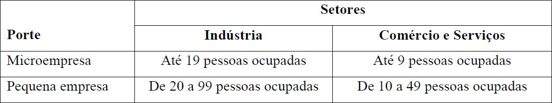 Portanto, como observado no Quadro 1, o Sebrae (2012) define as empresas pelo número de empregados, em que a microempresa no setor industrial é aquela com até 19 pessoas ocupadas, e no setor de comércio e serviços é aquela com até 9 pessoas ocupadas. Já a pequena empresa, na indústria, caracteriza-se por ter de 20 a 99 funcionários e, no comércio/serviço, de 10 a 49 funcionários.