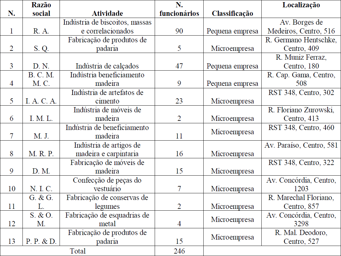 Com relação ao mapeamento das MPE’s, no Quadro 2, encontra-se a listagem das empresas no ramo industrial encontradas na área urbana da cidade de Agudo – RS.