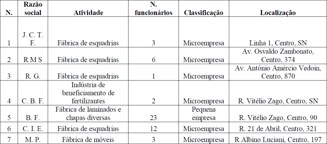 Com relação ao setor de atividade, pode ser visto que o setor madeireiro é o segmento de maior concentração, e por segundo o setor com mais empresas são as fábricas de produtos de padaria. Pode-se verificar que, no setor madeireiro, há cinco MPE’s, contudo, são as empresas de produtos de padaria que empregam 44% de pessoas que atuam no ramo industrial da cidade.