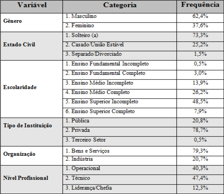 Observa-se que a amostra é formada predominantemente por profissionais com idade entre 16 e 30 anos, solteiros (73,3%) e com nível superior em andamento (48,5%). Diante disso, partese do pressuposto de que o alto nível de escolaridade pode ser derivado do aumento da demanda por mão de obra técnica e especializada, diminuição da desigualdade social, maior acessibilidade à educação superior e da segregação social de profissionais com pouca escolaridade (FREIRE, 1994). Paralelamente, supõe-se que os indivíduos da geração Y, diferentemente de gerações anteriores, tendem a adiar questões pessoais, como matrimônio e maternidade, visando adquirir primeiro maior nível de escolaridade, estabilidade econômicofinanceira e, consequentemente, melhor colocação no mercado de trabalho etc.