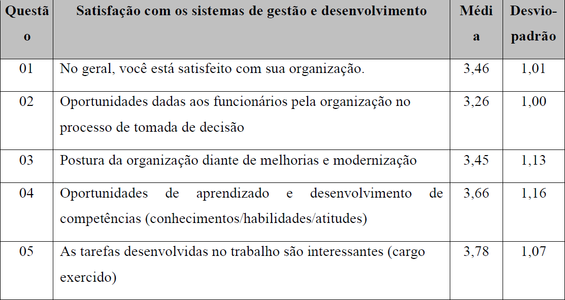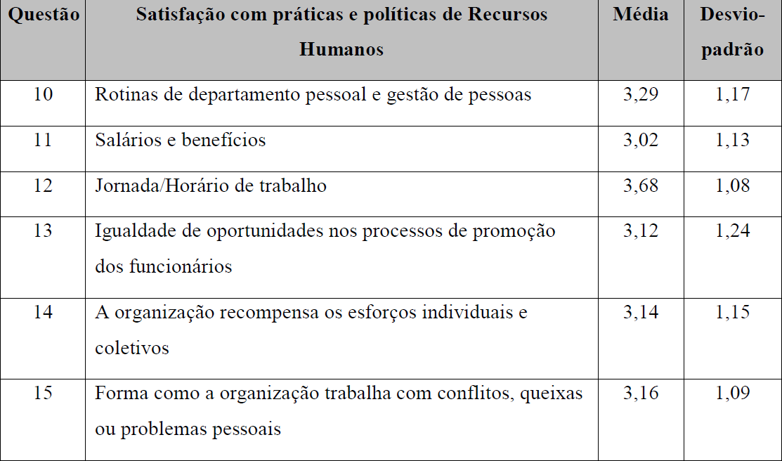 No Quadro 4 serão demonstradas as médias e o desvio-padrão do construto satisfação com práticas e políticas de Recursos Humanos.