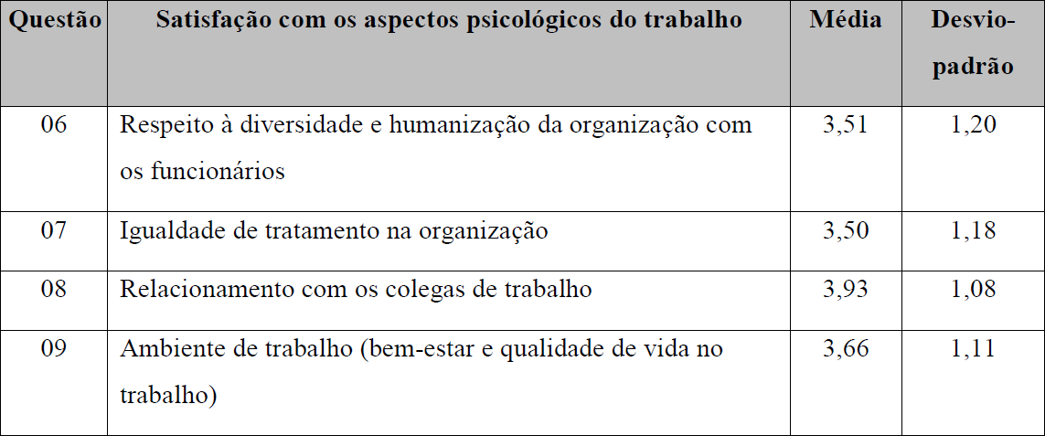 A seguir, o Quadro 3 apresenta a média e o desvio-padrão dos aspectos pesquisados relativos à satisfação com os aspectos psicológicos do trabalho.