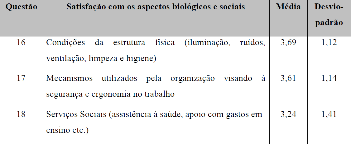 A seguir, no Quadro 5 são demonstradas questões que compõem o construto satisfação com os aspectos biológicos e sociais e suas respectivas médias e desvio-padrão.