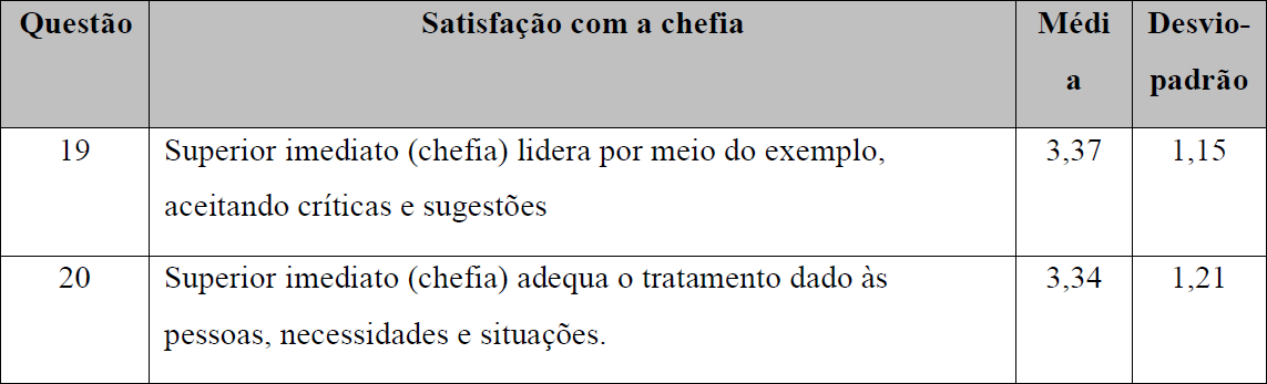 A Questão 18 obteve a média de 3,24 e o maior desvio-padrão da pesquisa de 1,41. Desse modo, ficou evidenciada contradição nas respostas, pois para 53% dos profissionais os serviços sociais de assistência médica, saúde e de ensino são satisfatórios. Por outro lado, 47% dos profissionais estão satisfeitos com estas condições. Observa-se que estes jovens tendem a se sentir em sua maioria, desassistidos por suas empresas nas questões de assistência social. A seguir, o Quadro 6 refere-se ao construto satisfação com a chefia.