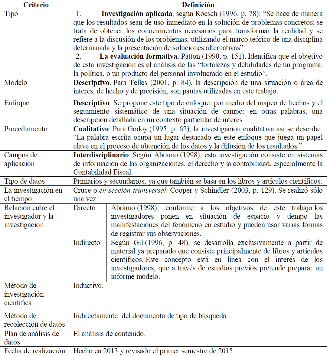 La clasificación de búsqueda se hace relevante, dado que el estudio indica circunstancias, restricciones y/o calificaciones de conducta fiscal para la recolección y el tratamiento de los datos, así como del carácter de los resultados (TELLES, 2001, p. 84). Los resultados de esta clasificación justifican la naturaleza de la investigación, y proporcionan elementos para la interpretación de este artículo. En la Tabla 1 se presenta la metodología utilizada para esta investigación.