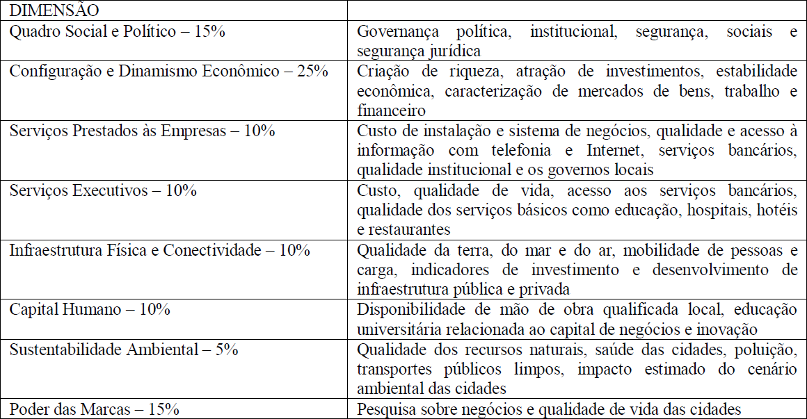 Em outro ranking elaborado pela revista britânica The Economist (2013), temos uma avaliação da competitividade de 120 cidades no mundo em que são analisadas a capacidade de atrair capital, os negócios, os talentos e os turistas além também dos desafios ambientais, do caráter cultural e social, entre outros aspectos.