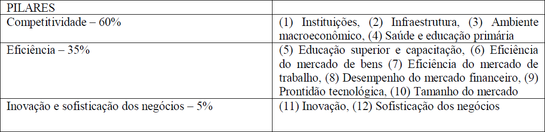 O GCI – Global Competitiveness Index, elaborado pelo World Economic Forum – WEF, constitui-se da compilação de dados privados e públicos de doze categorias que consolidam a imagem de competitividade de cada um dos países. Este ranking analisa dados de 148 países em uma pesquisa feita a partir da combinação de dados estatísticos nacionais e internacionais, coletados de executivos, buscando avaliar as condições oferecidas pelos países. Sua divulgação é anual.