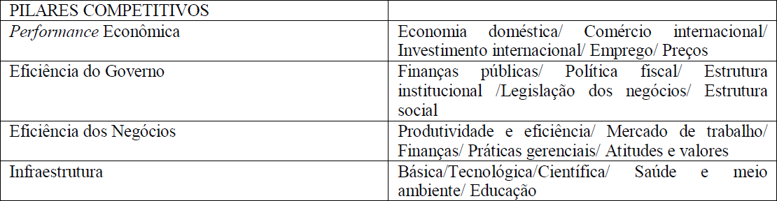 O WCY – World Competitiveness Yearbook, elaborado pelo IMD – Institute for Management Development –, é considerado o mais renomado e abrangente guia sobre competitividade no Mercado mundial com publicações desde 1989; avalia as condições de competitividade de 60 países. A metodologia aplicada na mensuração dos resultados utiliza dois grupos de indicadores, divididos em quatro pilares competitivos. Os indicadores econômicos dizem respeito ao ano anterior ao lançamento do relatório, já os indicadores provenientes da pesquisa de opinião com executivos, permitem identificar como a competitividade é percebida pelos empresários e se aproximam da realidade do ano em que a pesquisa é lançada.