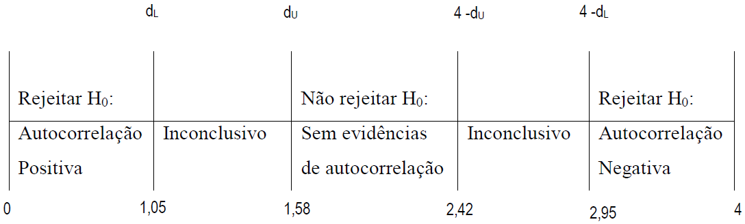 Como o resultado do teste foi de 1,86 não há evidências de autocorrelação. Logo, as premissas do MQO foram respeitadas e os parâmetros da regressão podem ser analisados.
