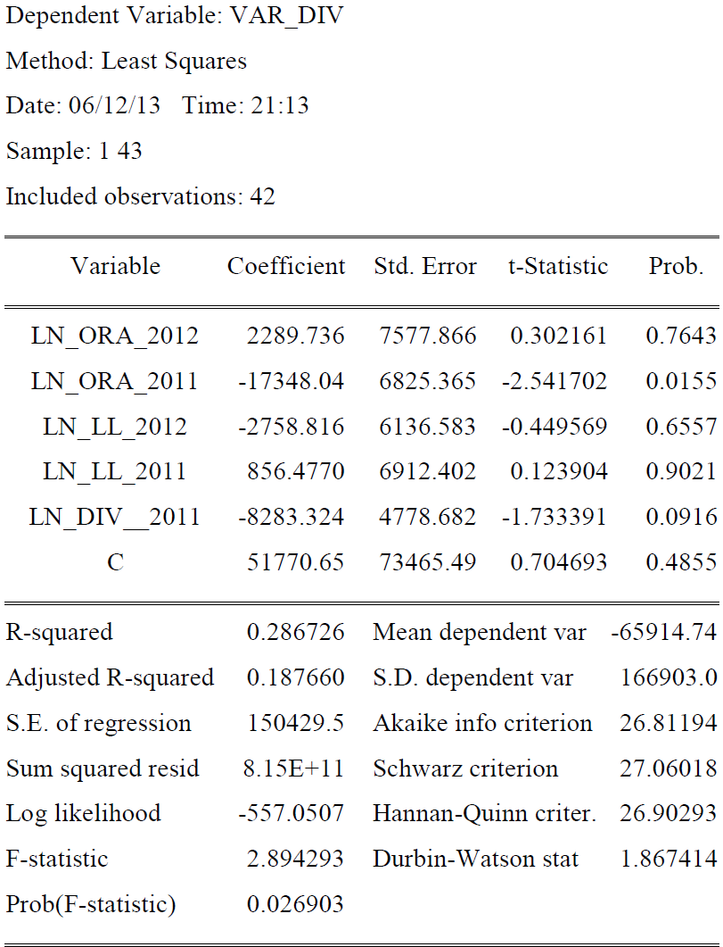 Procedeu-se a análise estatística dos dados através da regressão no software EViews, tendo-se como variável dependente os valores da variação dos dividendos do ano 2012 para 2011; e como variáveis independentes outros resultados abrangentes em 2011 e 2012, resultado líquido do exercício em 2011 e 2012 e dividendos pagos em 2011, dos quais foram obtidos os seguintes resultados: