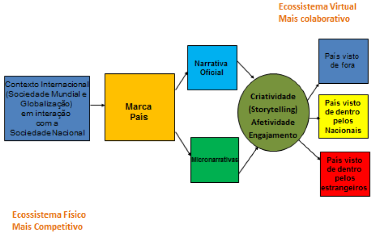 Nessa figura se mostra como cada marca país está submersa numa complexa rede de inter-relações que a envolvem num contexto nacional e internacional eminentemente competitivos e que e hoje envolve ecossistemas virtuais e físicos. A marca país é fruto desses complexos nexos, que por sua vez geram uma narrativa oficial, repetida pela grande mídia e instituições públicas; paralelamente cria também as micronarrativas dos participantes anônimos no processo. Tanto a narrativa tradicional como as micronarrativas irão gerar olhares diferentes: o país visto de fora, sobretudo pelos estrangeiros; o país visto de dentro pelos nacionais e o país visto de dentro pelos estrangeiros. O presente estudo priorizou este último olhar e, em específico, o olhar dos imigrantes cubanos sobre o Brasil.