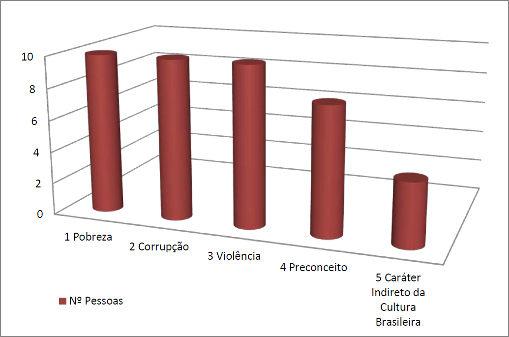O gráfico 1 apresenta os atributos negativos da marca país Brasil para os imigrantes cubanos, citado pela mesma quantidade de pessoas (90%), quais sejam; pobreza, corrupção, violência e preconceito, seguidos num patamar menor pelo caráter indireto da cultura brasileira. Este último aspecto se refere à característica do brasileiro de em determinadas situações não definir sua postura, “ficar em cima do muro” ou não falar de forma clara o que realmente deseja.