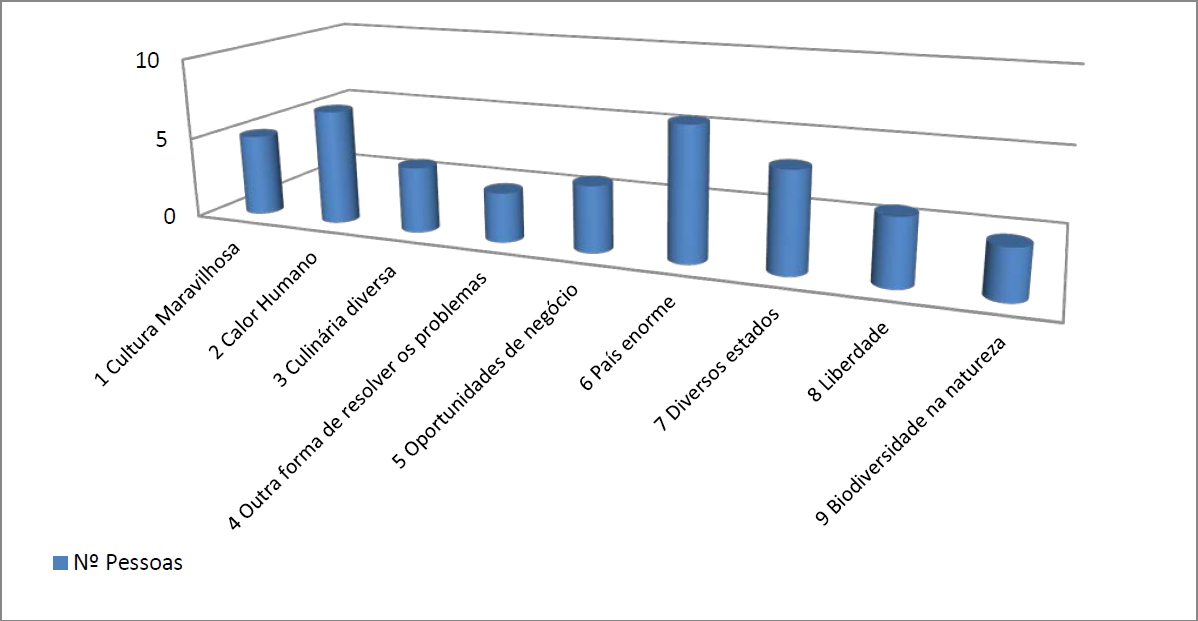 Apesar da escolha não intencional pelo critério a ser seguido na amostragem de pessoas entrevistadas, foi detectada uma característica em comum nas testemunhas. Todas concordaram em ter uma visão positiva do Brasil antes de chegar (10 Pessoas para um 100%).