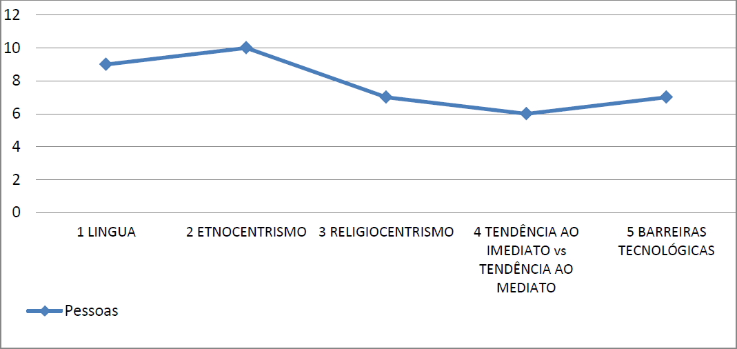 Como pode ser apreciado no gráfico 3, as barreiras culturais à comunicação mais mencionadas pelos participantes da pesquisa foi a do etnocentrismo (entendida como a rejeição a seu país de origem) mencionada por todos, seguida do não conhecimento da língua com 80% e religiocentrismo (entendido como a rejeição às religiões trazidas de seu país) mencionada por 70%; seguida da tendência à procura do resultado imediato, típica do brasileiro, atitude diferente do cubano, que busca resultados a mais longo prazo, com 60%.