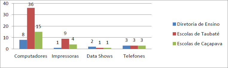 Além dos equipamentos utilizados para o exercício das funções daqueles que trabalham na Diretoria de Ensino e escolas, conforme indicados na Figura 1, são utilizadas como ferramentas tecnológicas a Internet (e-mail, Google, Facebook e Blogs) e os programas Excel e Word.