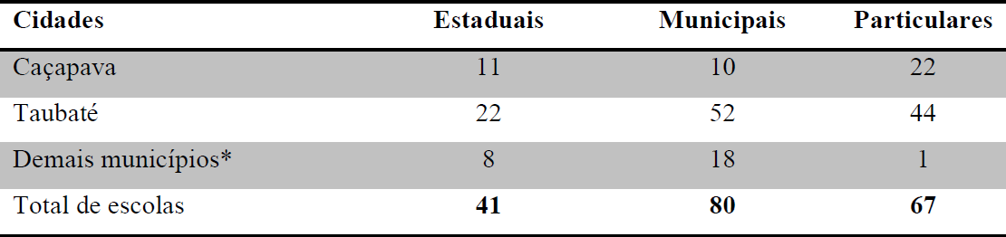 O estudo foi realizado em duas escolas estaduais pertencentes à área de atuação da Diretoria de Ensino de Taubaté e com dois Supervisores de Ensino que trabalham neste órgão. A esta Diretoria de Ensino estão jurisdicionadas escolas estaduais, municipais e particulares de oito cidades da região, conforme descritas na Tabela 1.
