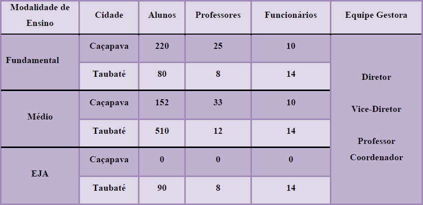 As escolas escolhidas estão localizadas nos municípios de Taubaté e Caçapava, com peculiaridades e dimensões próprias, como evidenciam o Quadro 1.