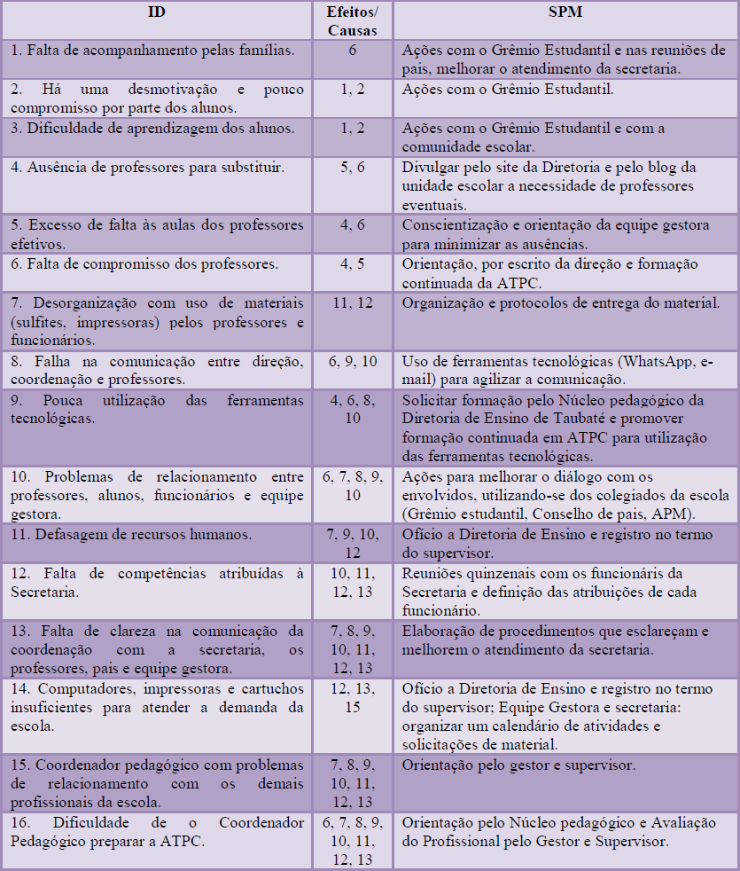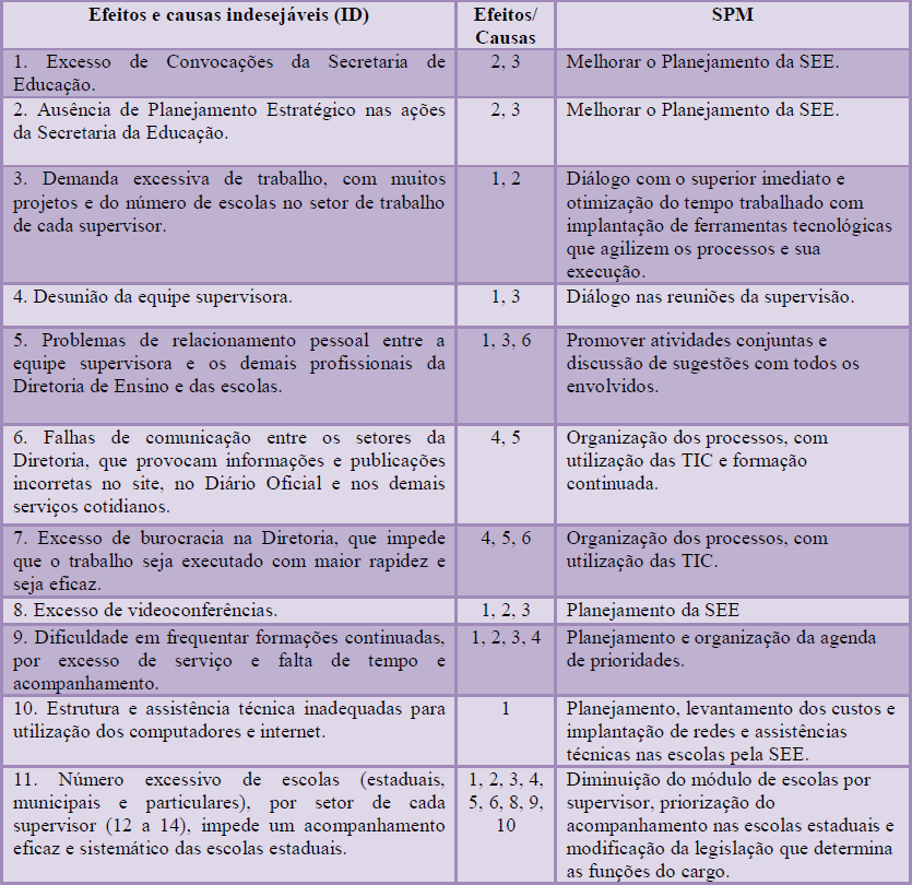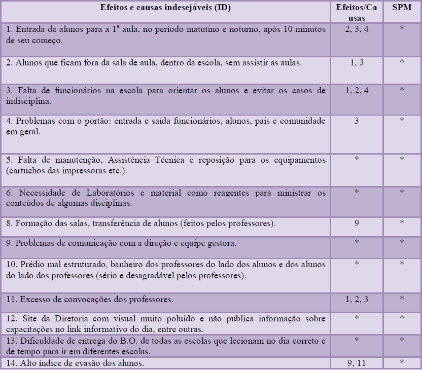 A seguir são apresentados nos Quadros 3 e 4 dados das duas escolas estaduais que participaram dessa pesquisa, com apontamentos dos Efeitos e causas indesejáveis bem como os Projetos de Melhoria destes Efeitos e causas indesejáveis. Porém, somente em relação aos dados referentes à escola de Caçapava são apresentadas sugestões de melhoria dos problemas levantados (SPM).