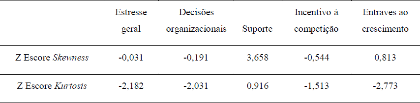 De maneira geral, a relação entre as médias e desvios padrão das demais variáveis, incluindo sociodemográficas e variáveis métricas, referentes às escalas, mostraram-se aceitáveis, com os coeficientes de variação (desvio padrão dividido pela média) superiores a 0,0001, indicando a ausência de necessidade de transformações. Os Z escores das variáveis métricas são apresentados na tabela 1. Na mesma é possível observar que em apenas duas variáveis (EEO2 e EEO4) um dos Z escores está acima de ±2,58, enquanto nas demais ambos os escores estão abaixo de ±2,58. Tais resultados indicaram que não há problemas substanciais em relação à distribuição normal das variáveis, podendo ser mantidas como estão.