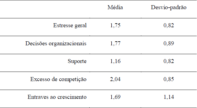 É fato que as pesquisas citadas não foram realizadas com estressores organizacionais, mas sim ocupacionais. Logo, devem ser ressaltadas as características distintas e específicas de estresse organizacional e estresse ocupacional. Enquanto o primeiro envolve características organizacionais como um todo que são potencialmente estressoras, o segundo trata da incapacidade do colaborador em lidar com as exigências do trabalho e/ou da tarefa desempenhada. Os participantes dos estudos de Stefano e Roik (2005) e Kumar e Sundaram (2014) podem ter encontrado dificuldades em lidar com elementos ocupacionais estressores, mas, na amostra do presente estudo, isto não se repetiu em se tratando de características organizacionais, exceto no fator referente ao incentivo excessivo à competição.