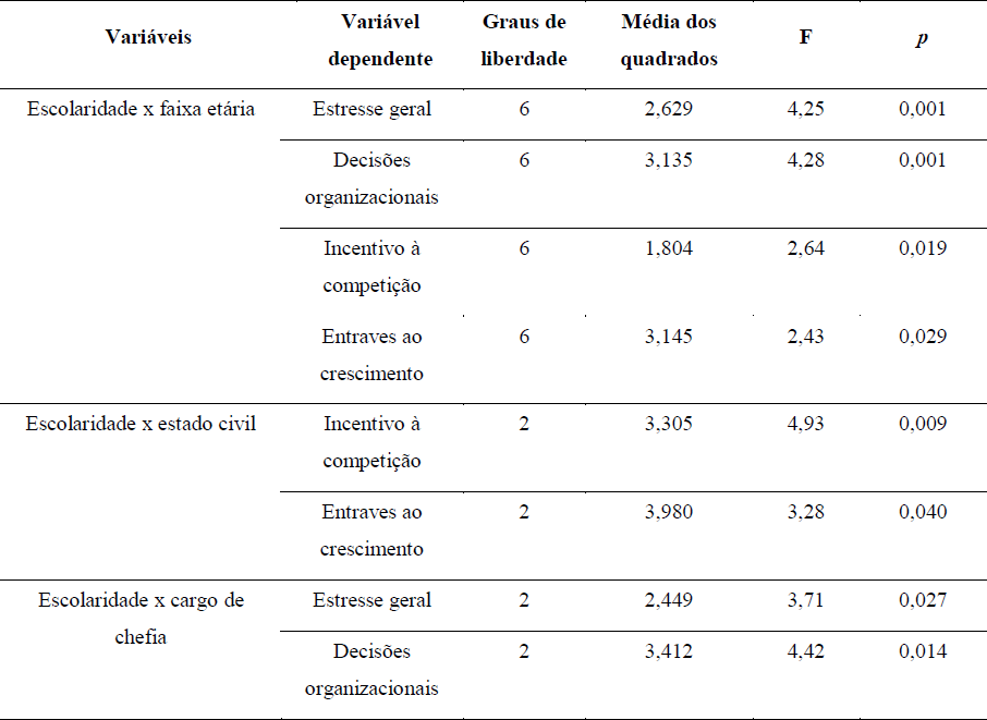 Nos fatores estresse geral e decisões organizacionais houve diferença significativa em função das interações entre escolaridade e faixa etária, e escolaridade e cargo de chefia. Por sua vez, nos fatores incentivo à competição e entraves ao crescimento as diferenças foram encontradas em decorrência das interações entre escolaridade e faixa etária, e escolaridade e estado civil.
