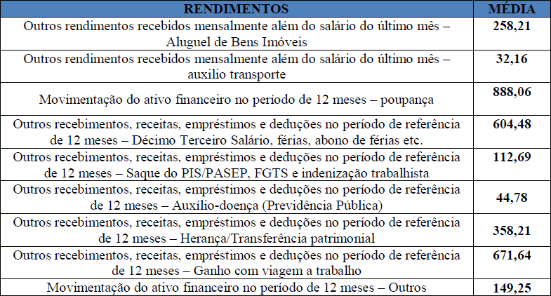 Dentre outros rendimentos e recebimentos além do salário, os entrevistados indicaram especialmente recursos de poupança e ganhos com viagem a trabalho (ver Tabela 1).