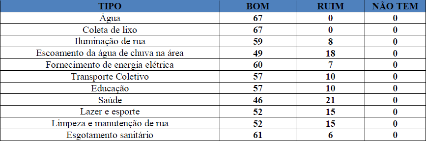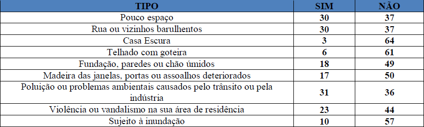 As condições de moradia em relação aos serviços do bairro eram consideradas boas no que tange ao fornecimento de água e à coleta de lixo; já o escoamento da água de chuva e os serviços de saúde sofreram críticas (ver Tabela 24), assim como existiam problemas de poluição ou problemas ambientais causados pelo trânsito ou pela indústria, assim como problemas trazidos por pouco espaço e por vizinhos barulhentos (ver Tabela 25).