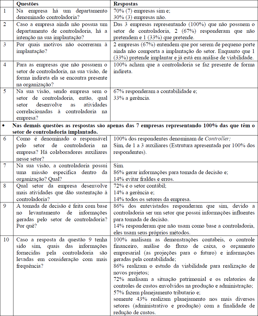 A título de esclarecimento, o questionário foi aplicado para dez empresas, à primeira pergunta tinha por objetivo saber quantas empresas pesquisadas possuem o setor de controladoria implantado. Como havia a possibilidade de encontrar empresas sem o setor referido, então, dentre o total do questionário, elaborou-se quatro questões especificamente para elas, da questão dois a cinco. O percentual aqui apresentado nestas questões se refere a 100% das que não possuem o setor de controladoria implantado na empresa. As demais questões representam 100% das empresas pesquisadas que possuem o setor de controladoria e foram respondidas por elas, conforme exposto no Quadro1.