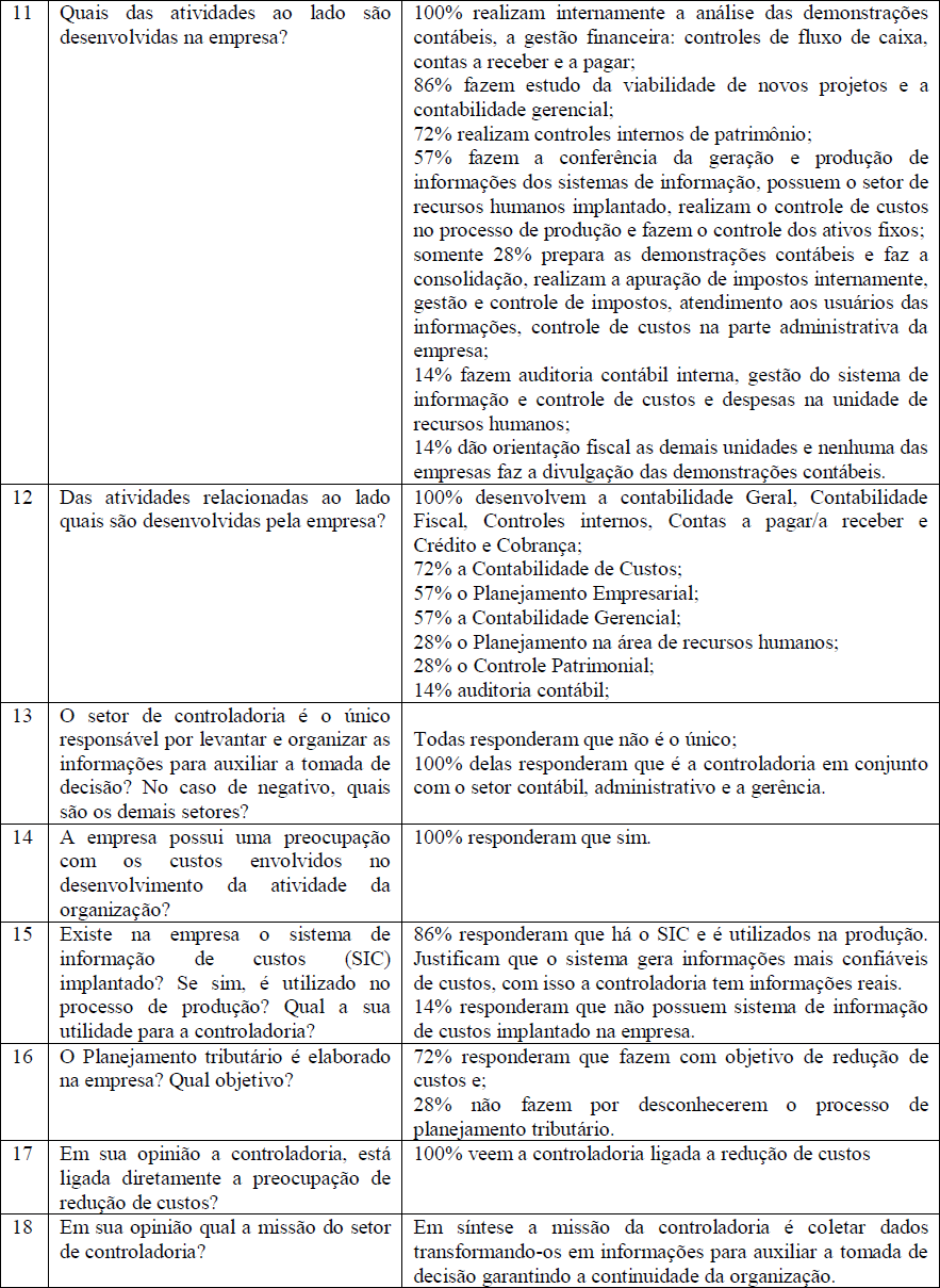 As respostas do questionário aplicado com objetivo de evidenciar a influência da controladoria na geração das informações para o processo de gestão de custos de indústrias moveleiras na região de Francisco Beltrão – PR, estão tabuladas e representadas no Quadro 1. O resultado da pesquisa foi apresentado em forma de quadro para facilitar a exposição e a visualização, consequentemente, visa melhorar o entendimento do leitor.