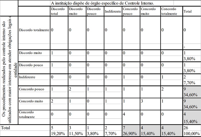Pode-se verificar que os respondentes entendem, em maioria com 84,6% (34,6%, concorda pouco, 34,6% concorda muito e 15,4% concorda totalmente) que os procedimentos realizados pelo controle interno são utilizados com maior interesse em atender obrigações legais da entidade, sendo que destes, 57,7% (26,9% concorda pouco, 15,4%% concorda muito e 15,4% concorda totalmente) concordaram que há controle interno na entidade.