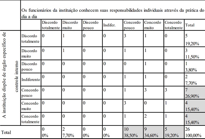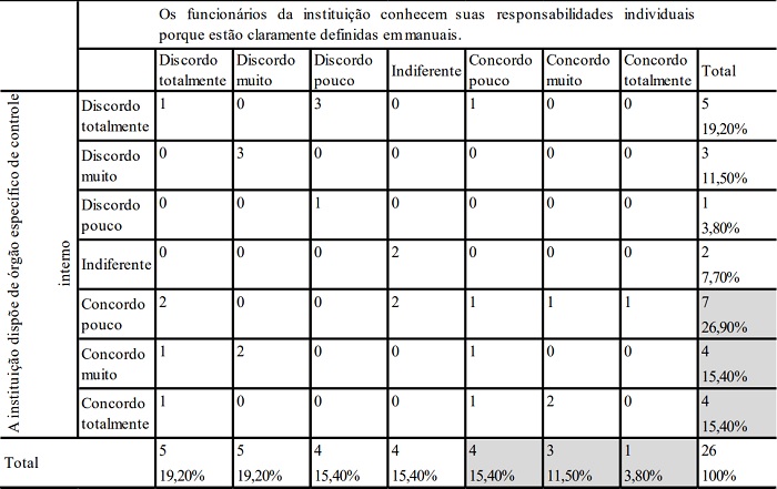 De acordo com os resultados do cruzamento das respostas da Tabela 2 demonstrados pela tabela de contingência, percebe-se que em torno de 58% dos respondentes afirmam a existência de órgãos específicos de controle interno, mas quando se busca verificar a ciência de responsabilidades individuais dos funcionários das fundações este número cai para 30,7%, evidenciando que os atores responsáveis pelo controle interno enxergam deficiências quanto ao processo do uso de manuais de controle interno.
