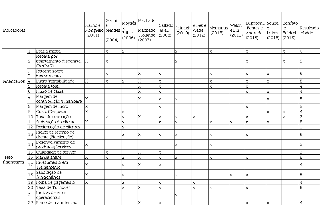Lugoboni, Fontes e Andrade (2013) buscaram conhecer como são feitas as análises de desempenho organizacional e os indicadores de desempenho mais utilizados na hotelaria. Realizaram um survey com 16 hotéis de São Paulo. Constatou-se que “econômicas e financeiras, clientes e operações” são as dimensões mais frequentes na mensuração do desempenho, enquanto “clientes, operações e econômicos e financeiros” são tidas como as mais importantes, assim como, as dimensões “econômicas e financeiras, clientes e operações” são as dimensões mais utilizadas para a tomada de decisão.