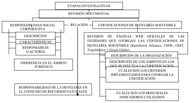 La información presentada es el resultado de investigaciones documentales, con un fundamento metodológico de carácter descriptivo y analítica y con un sentido de triangulación de los diferentes documentos revisados. En un primer momento se evidenció cómo las prácticas de la hotelería sostenible se insertan en el ámbito de la competitividad del sector turístico, como ejemplo específico de los agentes de la economía social, partiendo en un primer momento de la vinculación existente entre esta economía y la RSC, destacando en este marco referencial, las certificaciones de hotelería sostenible que hoy día están en la vanguardia de la formulación de indicadores para medir la sostenibilidad de las operaciones, gestión, planificación y desarrollo general de la actividad turística, con mayor énfasis en la hotelera. En tal sentido, se hizo una revisión minuciosa de las páginas Web oficiales de algunas de estas instituciones, como la Rainforest Alliance, la Organización Mundial del Turismo (OMT), TripAdvisor y Green Globe, para hallar finalmente los criterios que estas manejan para certificar la hotelería sostenible y, en consecuencia, a partir de un análisis reflexivo, articular dicha actuación con los preceptos de las RSC. La metodología empleada se sintetiza en la siguiente figura.