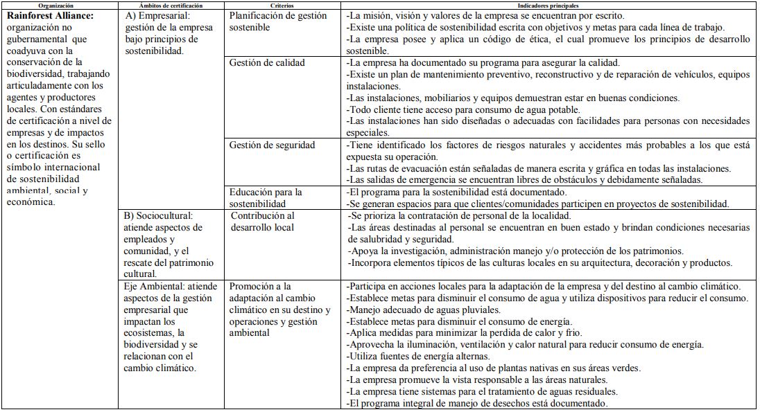 RAINFOREST ALLIANCE. Certificaciones Turísticas en Centroamérica, 2002. Obtenido de http://www.rainforest-alliance.org/tourism/documents/certification_study Consultado el 12 de diciembre de 2017.