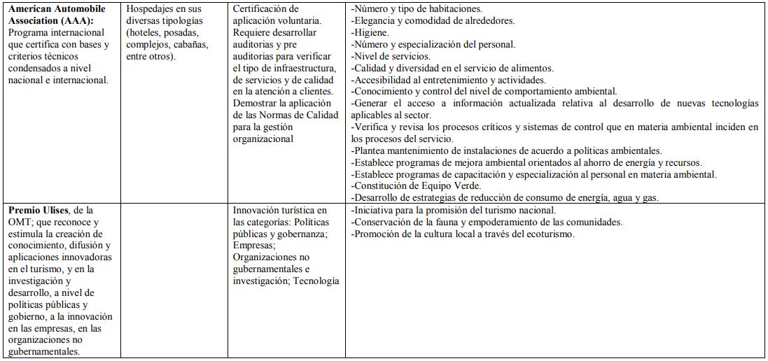 Estos programas de certificación de turismo sostenible, según un estudio desarrollado por la OMT en el año 2002, cuando existían 104 tipos de certificaciones dadas a servicios de alojamientos, de restauración, a instalaciones deportivas y recreativas, a atracciones turísticas, operadores de “tour”, empresas de transporte (turístico) y asociaciones turísticas, se centraban en el desempeño ambiental de las empresas, de los servicios y de los destinos, en la calidad de los productos ofrecidos y en la RSC de las empresas prestadoras del servicio turístico y en los que las certificaciones dependen de “[…] las características de los productos y servicios, […] los procesos productivos, […] con un enfoque de mejora continua.” (Rebolloso y Salcedo, 2007, p. 80). Todo ello permite, al tejido empresarial turístico, no solo asegurar que sus operaciones sean soportadas en el tiempo, sino además “[…] que los productos o servicios identificados con un sello de conformidad sean reconocidos y elegidos por los consumidores, como garantía de seguridad y confianza.” (Rebolloso y Salcedo, 2007, p. 80); de lo cual se desprende la condición de competitividad que la empresa turística obtiene a través de las prácticas del turismo sostenible.