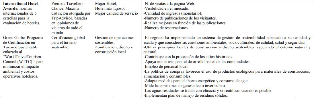 En la Tabla n. 1 se sintetizan algunos de los principales ámbitos, criterios e indicadores de sostenibilidad, enfatizando en aspectos arquitectónicos y de las condiciones naturales del medio de emplazamiento, utilizados por organizaciones de todo el mundo para certificar a los hoteles como sostenibles. Estas certificaciones con criterios de desempeño al responder, según la OMT (2002), a objetivos ambientales con prácticas ambientales responsables, a objetivos socioculturales, a la integración de las comunidades al proceso, a la protección de la herencia cultural y a objetivos económicos expresados en la necesidad de mejorar los sistemas de gestión, con impacto directo en las finanzas de la empresa, coinciden con las prácticas de la RSC y los objetivos de la economía social, al considerar los intereses de todos los grupos (empleados, colectividad o comunidad receptora, generaciones futuras) y no sólo los beneficios económicos de los propietarios de la empresa.