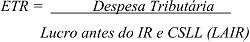 Conforme utilizada por diversos pesquisadores (TANG, 2005; MINNICK; NOGA, 2010; MACHADO, 2011; GOMES, 2016) para o cálculo da ETR, são divididas as despesas com tributos, nesse caso, correntes e diferidas, pelo lucro antes do imposto de renda e contribuição social: