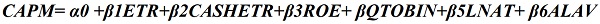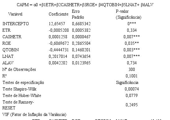 Em que CAPM representa o custo de capital próprio e é a variável dependente do modelo, isto é, a variável a ser explicada pelas variáveis independentes, que são a ETR e a CASHETR, ou seja, as métricas de identificação da governança tributária. ROE, QTOBIN, LNAT e ALV são variáveis de controle para retorno sobre o patrimônio líquido, valor de mercado, tamanho da companhia e alavancagem financeira da empresa.