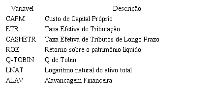 A Tabela 1 apresenta as variáveis que foram utilizadas no modelo econométrico e significam, respectivamente, neste caso, o CAPM como a variável relacionada ao custo de capital próprio, ETR e CASHETR como as variáveis de gerenciamento tributário, e ROE, Q-TOBIN, LNAT, e ALV como as variáveis controle.