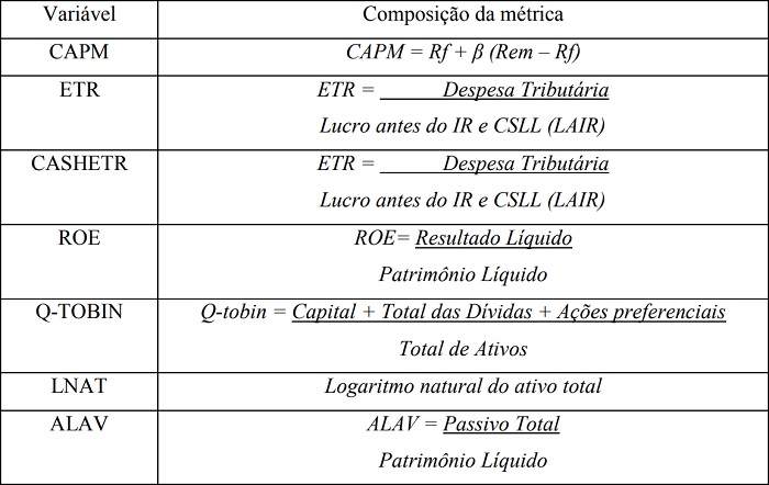 Já a Tabela 2 apresenta a composição de cada variável utilizada no modelo, isto é, a sua forma de cálculo utilizada nesta pesquisa.