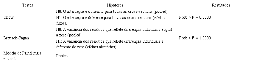 Como os dados estavam organizados em regressão múltipla do tipo painel, inicialmente, foi necessário realizar os testes específicos a fim de estabelecer qual é o painel mais indicado para análise dos dados. Assim, utilizou-se dos testes de Chow para evidenciar a adequação entre efeitos pooled ou efeitos fixos, no caso, painel, e o teste de Breush-Pagan para avaliar a utilização de modelos com efeitos aleatórios versus pooled.