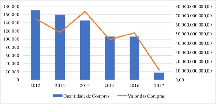 A quantidade e valores despendidos por meio de compras públicas no período de 2012 a abril de 2017, de acordo com a figura 1, confirmam que estas refletem um cenário muito impactante para a economia nacional. O volume de compras públicas, medido na casa dos bilhões, permanece em altos volumes em todos os anos, com exceção de 2017, pois se trata de um ano ainda no início e que, segundo as projeções econômicas de crise, tende a seguir os padrões dos anos anteriores, porém em patamares muito superiores ao atual.