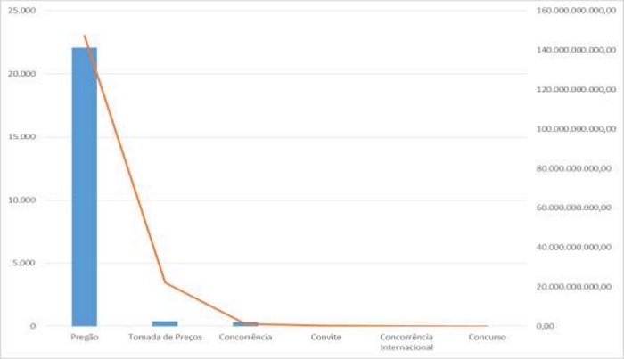 A figura 2 aponta em suas barras o volume de compras realizadas por modalidade, contabilizadas no eixo esquerdo, e a linha gráfica representa o valor em reais das transações efetuadas, contabilizados no eixo direito. É possível perceber grande destaque dado ao procedimento de pregão, em especial eletrônico, seguido da tomada de preços e da modalidade de concorrência, foco do presente trabalho.